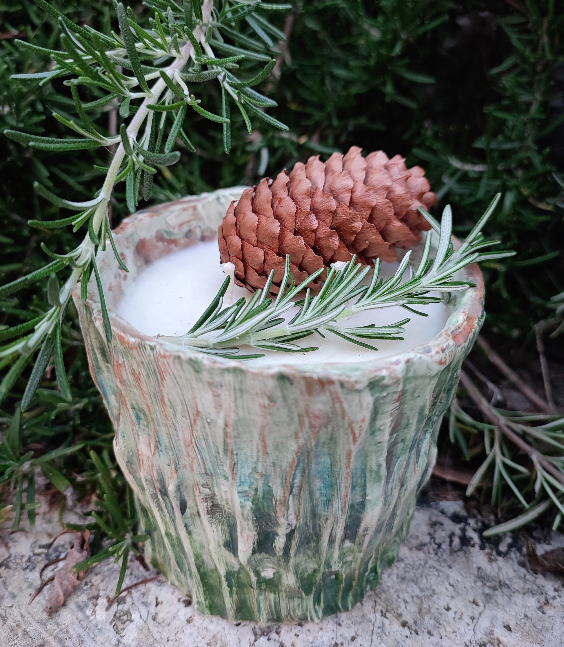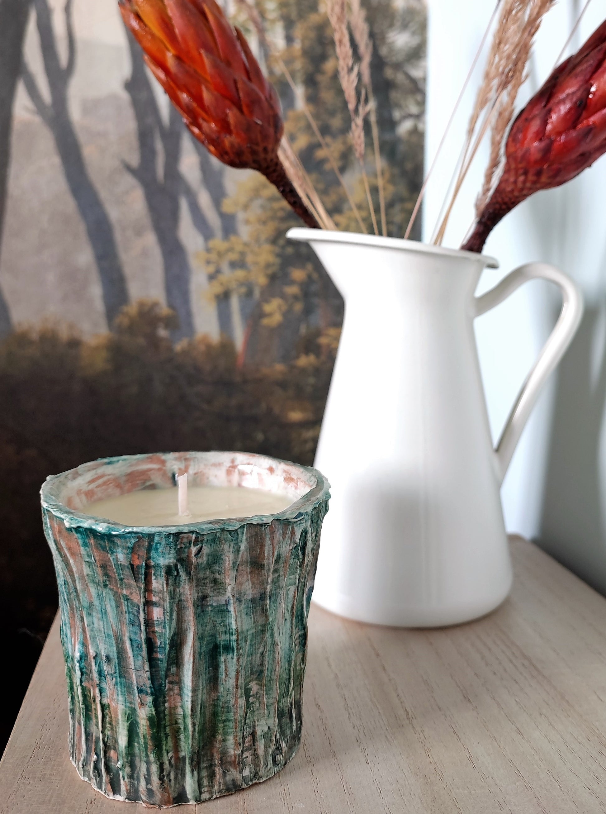 La candela è contenuta in un vasetto di ceramica fatto interamente a mano (non con l’uso del tornio) dalle sapienti mani dell’artista romana Marina Gozzi per Mush Candle. Lo stoppino utilizzato è di cotone bagnato con cera di soia.