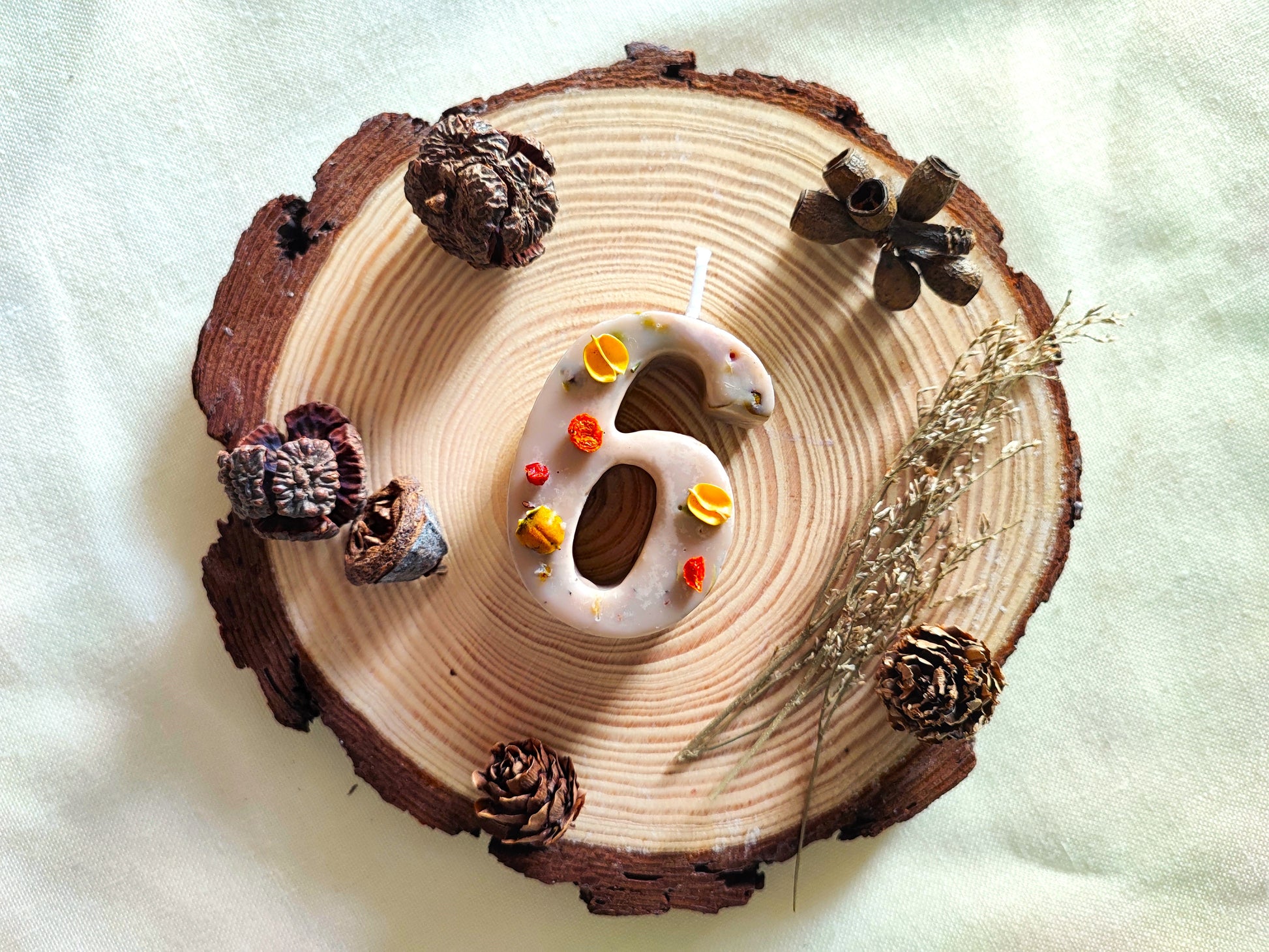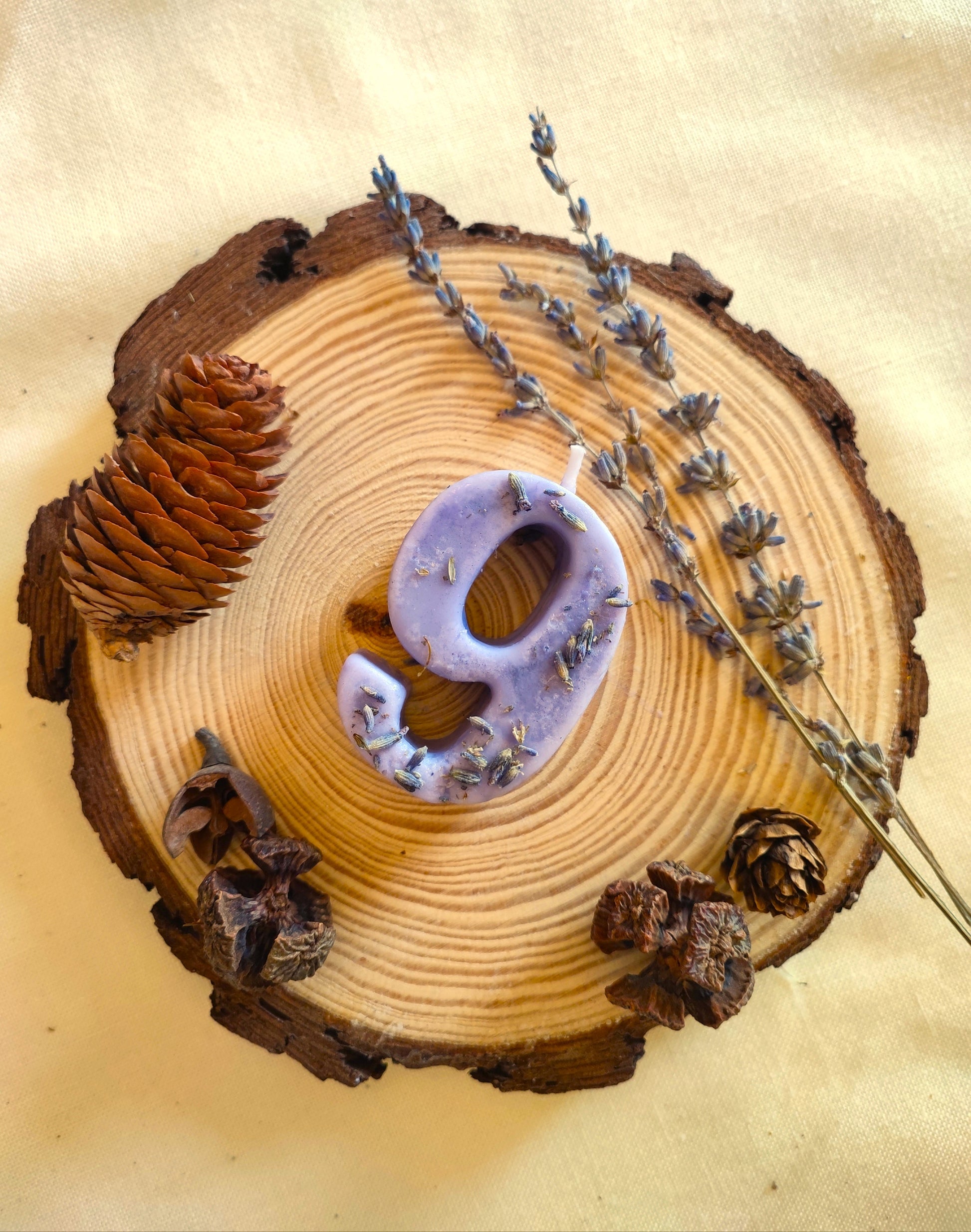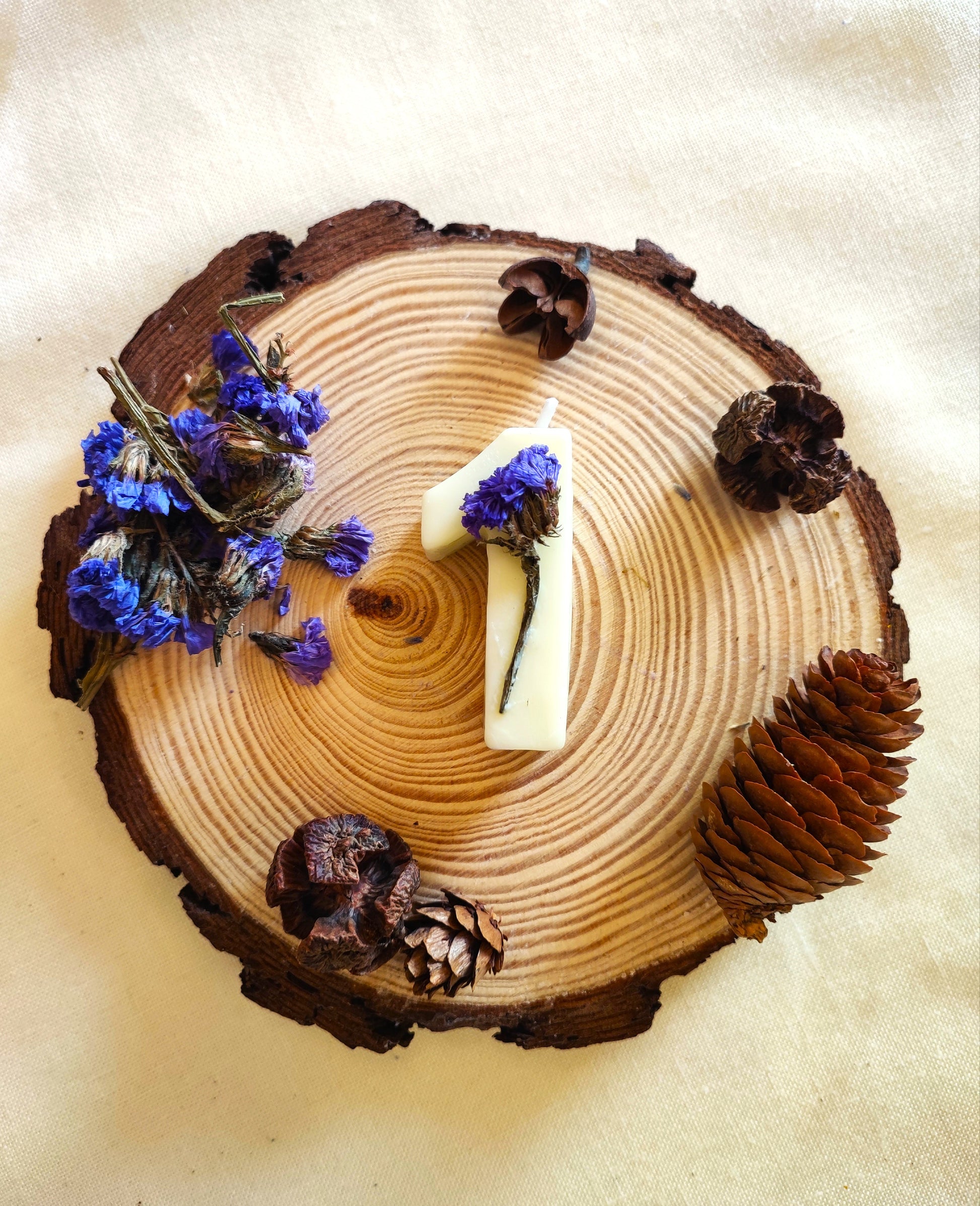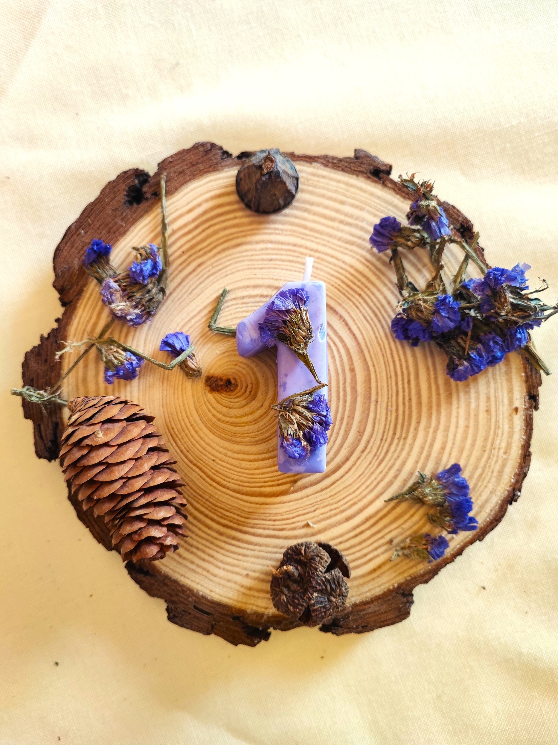Le candeline di compleanno sono le uniche candeline di compleanno realizzate interamente a mano con pura cera di soia e fiori, piante, bacche essiccati. Lo stoppino è in cotone bagnato con cera di soia e le colorazioni sono fatte usando unicamente pigmenti naturali.