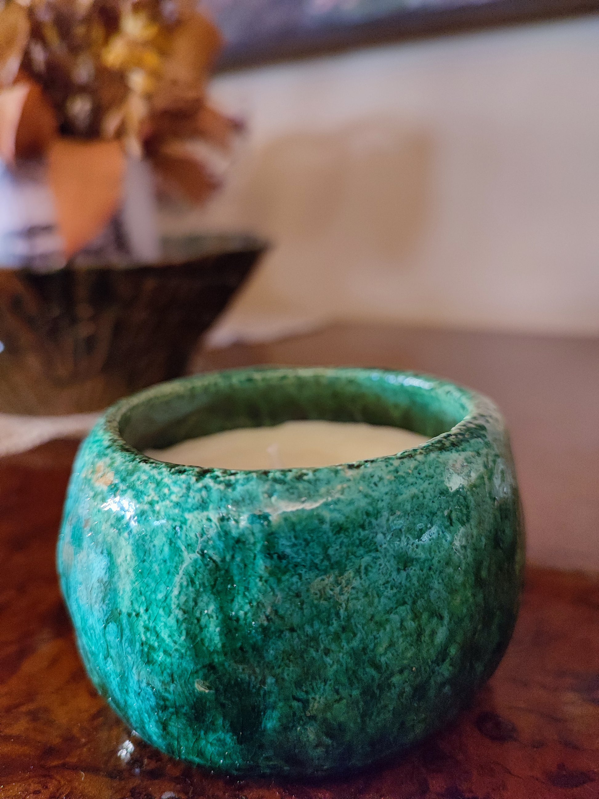 Candele colate in vasetti di ceramica lavorati a mano con tecnica Raku