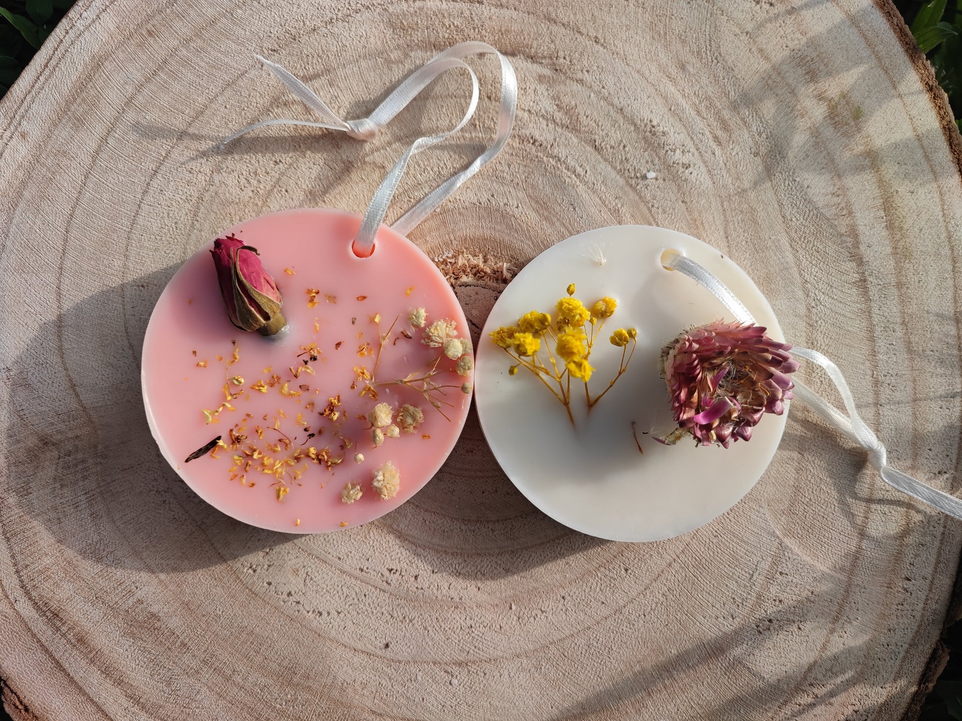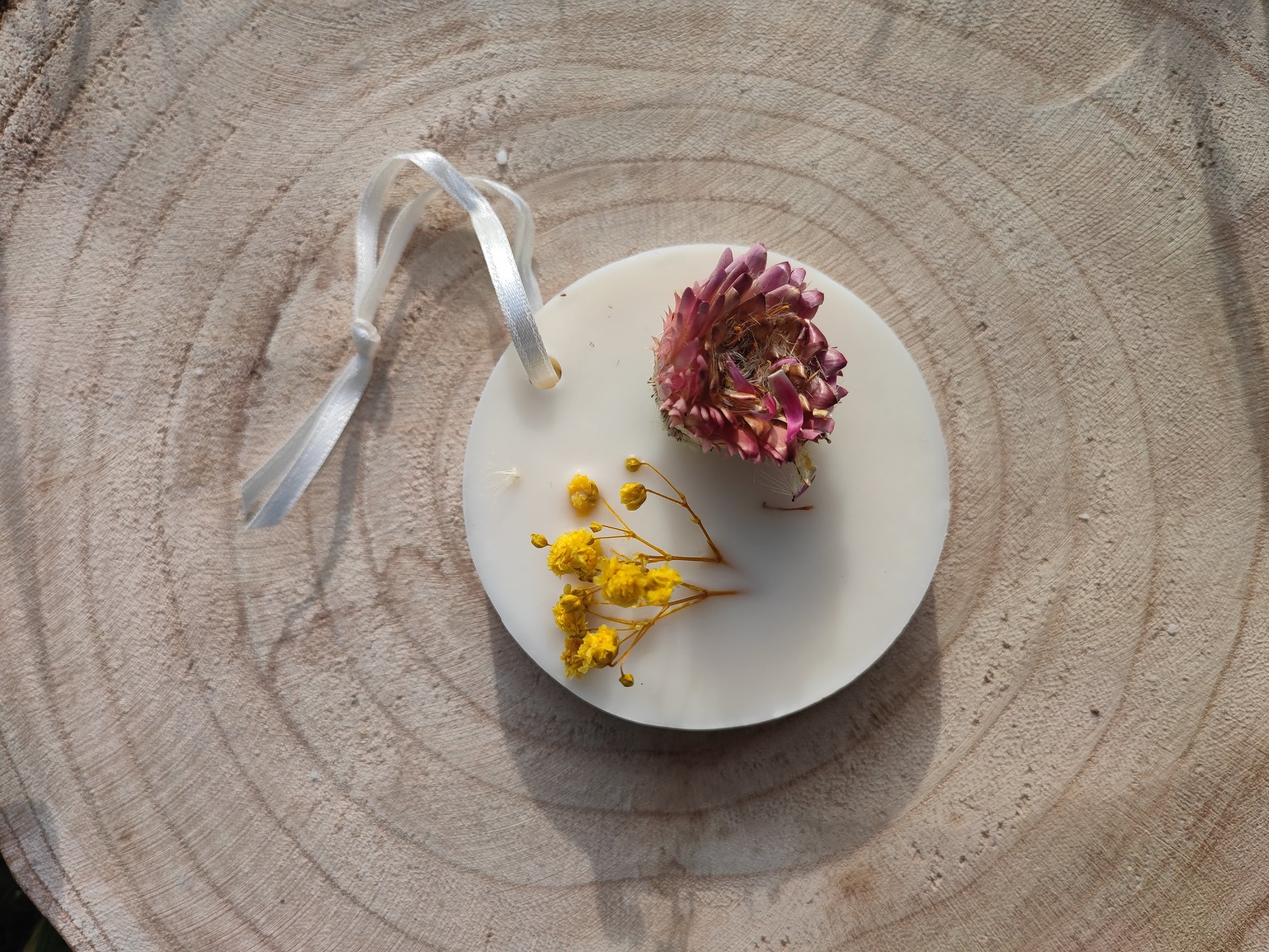 Tavoletta botanica a forma di cerchio realizzata a mano con pura cera di soia e oli essenziali e decorata con elementi naturali.
